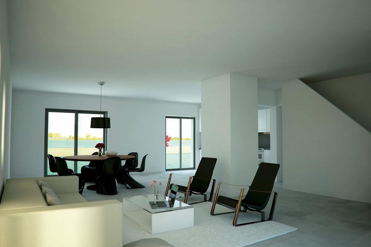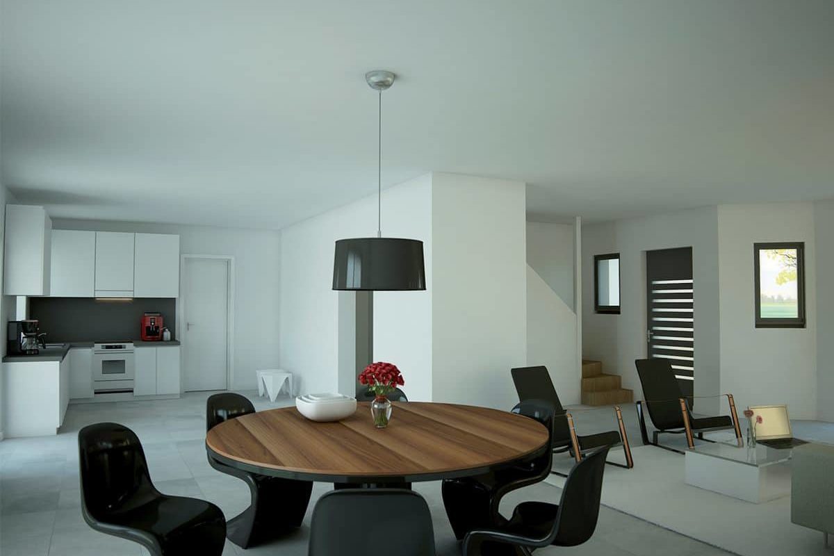 Elle est à la fois intemporelle et puise toute son originalité dans ses pans déstructurés et son avancée de forme rectangulaire. Son organisation des espaces rationalisés est favorisée par de généreux volumes qui créent un véritable sentiment d’espace, de liberté et une vraie qualité de vie. Ses nombreuses ouvertures la baignent de lumière naturelle. A l’étage, notre regard peut scruter un charmant jardin où les feuilles d’automne virevoltent par l’ouverture surplombant l’entrée.